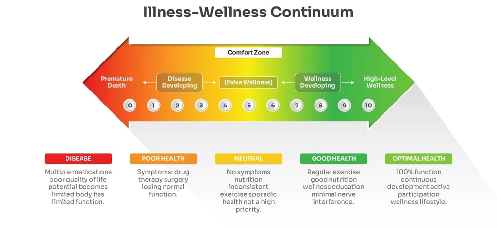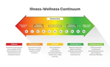 The Illness–Wellness Continuum shows that health isn’t just the absence of disease; it’s a spectrum that ranges from poor health on one side to high-level wellness on the other. Our therapies are designed to move you beyond just feeling “okay” toward true vitality—where your body performs at its best, not just free of pain but optimized for strength, resilience, and longevity.